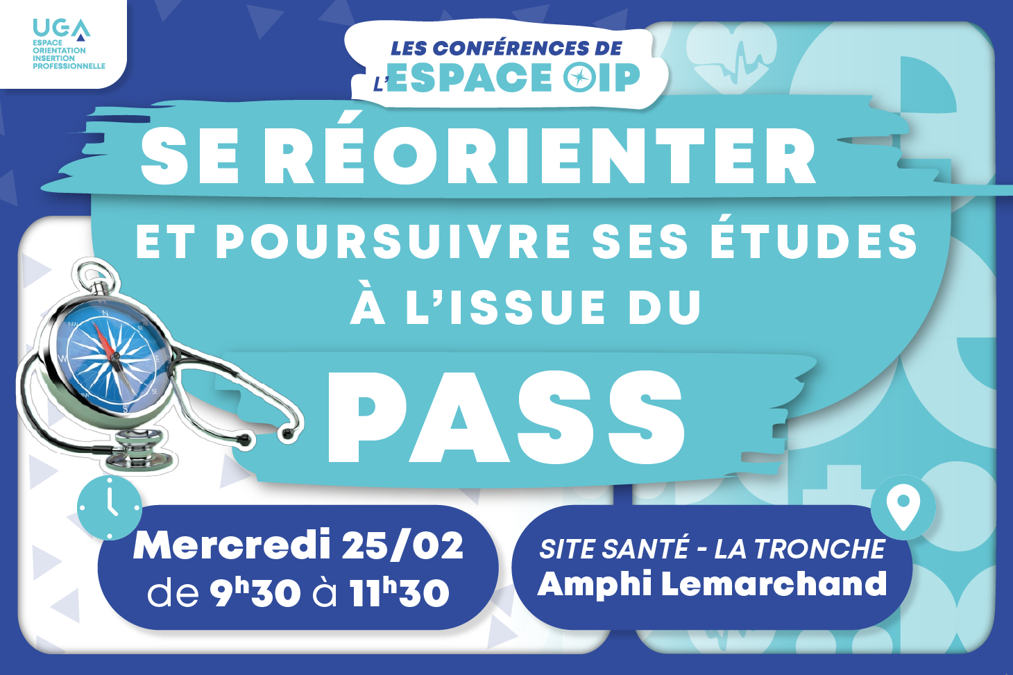 Vous êtes en PASS et vous souhaitez vous renseigner sur la réorientation à l'issue du PASS ? L'Espace orientation et insertion professionnelle et les responsables pédagogiques du PASS, de l'IFMK, de la L1 Biotechnologies pour la santé et des parcours de licences scientifiques du DLST vous proposent une conférence ainsi qu'un temps d'échanges sur les possibilités et procédures de réorientation et de poursuites d'étude.